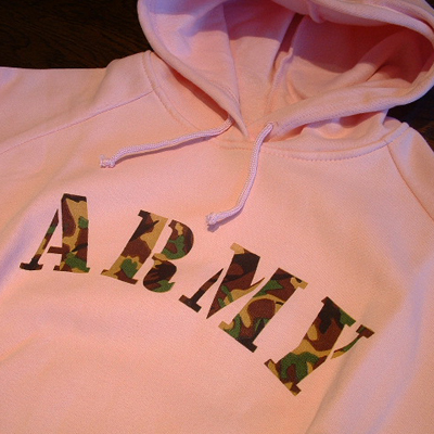 PINK ''ARMY'' HOODED SWEATSHIRT WORD "ARMY" IN CAMO PRINT 50% COTTON / 50% POLYESTER 8 OZ / POLY /COTTON OUTER SHELL WARM LINING DRAWSTRING HOOD TWO FRONT POUCH POCKETS ELASTIC WRIST CUFFS SIZES: XS TO XL, 2X --------------------------------------- |